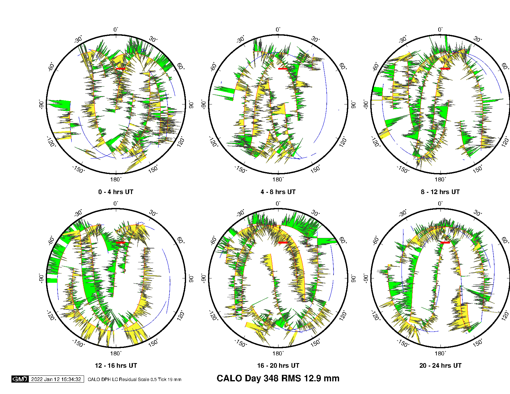 Diagram Sky-Plot merupakan diagram yang menjelaskan efek multipath dan efek kanduangan uap air pada data pengamatan. Diagram ini didapatkan dari pengamatan one-way (undifferenced) LC phase residual yang diproyeksikan pada bentuk diagram azimuth dan elevasi dimana lokasi titik tengah pada diagram tersebut merupakan lokasi antena pengamatan GNSS. Diagram ditampilkan setiap 4 jam dalam 1 hari pengamatan. Nilai residu yang tinggi ditempat yang sama dalam waktu yang berbeda-beda dikategorikan sebagai residu akibat multipath, sedangkan kemunculan nilai residu tinggi pada lokasi tertentu dan waktu tertentu merupakan residu akibat kandungan uap air. Lengkungan merah dan biru merupakan trek satelit, warna kuning dan hijau masing-masing menunjukan residu positif dan negative. Batang merah menunjukan skala yang dalam hal ini ditetapkan 10 mm.