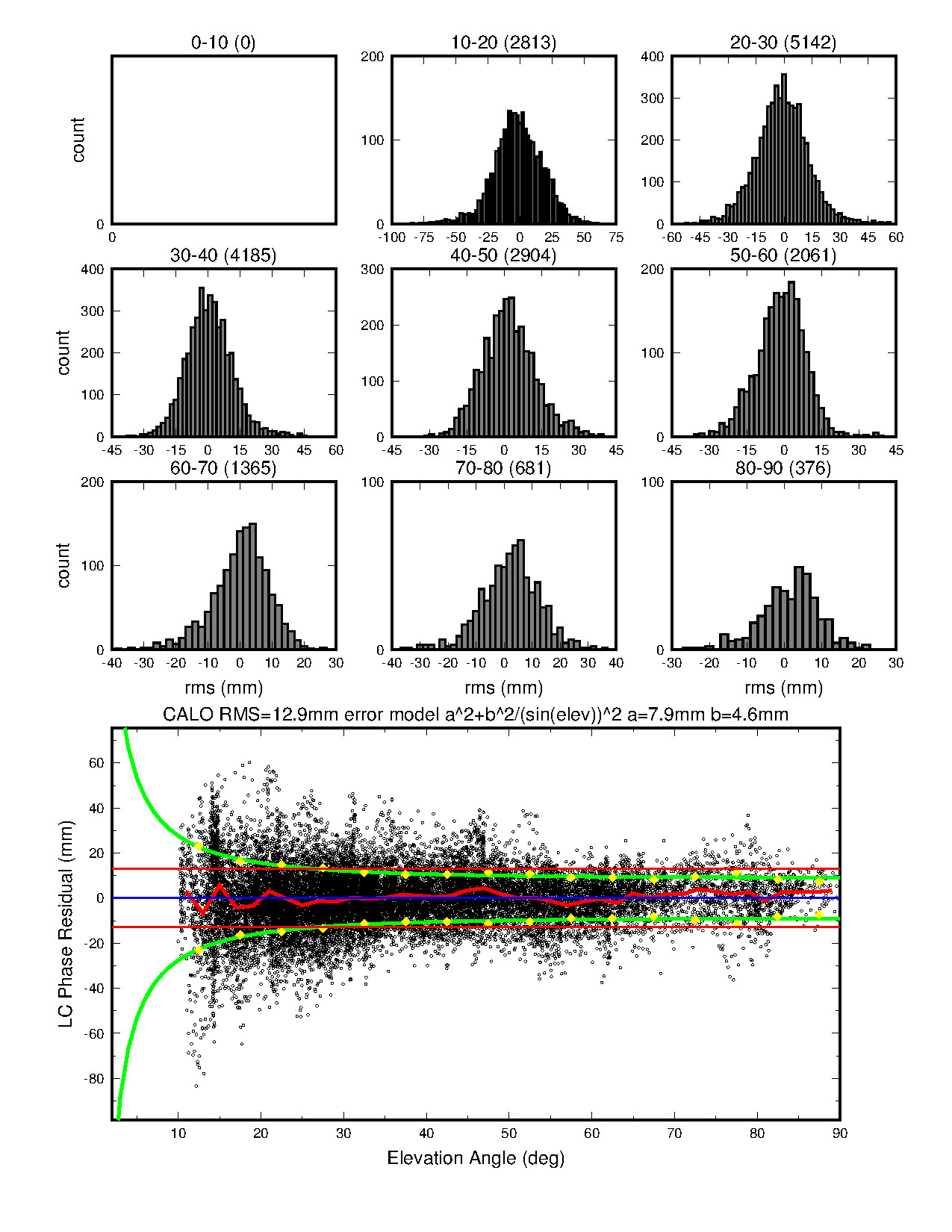 Phase Residual Plots menunjukan dua hal: pertama, tampilan diagram batang residual pengamatan setiap elevasi (dalam hal ini setiap interval elevasi 10 derajat). Semakin diagram membentuk distribusi normal pada setiap interval elevasinya, menunjukan kesalahan sistematis pengamatan pada setiap interval elevasinya sudah tertangani. Kedua, tampilan menunjukan Phase vs Elevation Angle. Garis hijau menunjukan elevation-dependent noise model , titik-titik hitam menunjukan distribusi residual dari elevasi 0 derajat hingga 90 derajat, garis merah tebal menunjukan nilai residual hasil smoothing. Bentuk garis merah tebal yang tidak menyimpang dari garus hijau menunjukan tidak adanya kesalahan penggunaan model antena. Penyimpangan nilai residual pada elevasi menengah ke atas diakibatkan oleh efek atmosfer.